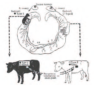 During this time, a study by Medawar’s team of the natural tolerance in freemartin cattle revealed a chink in the immunologic armor. In freemartin cattle, fusion of their placentas allowed the mixture of 2 animal circulations during gestation. After birth and throughout life, the animals shared each others blood cells (blood chimerism). Moreover, the cattle were tolerant to each others tissues and organs as shown at the bottom (Figure 8).