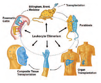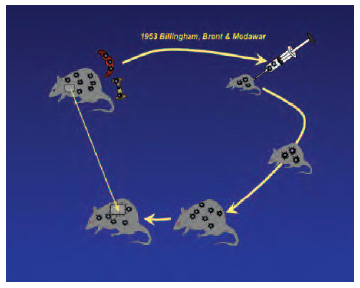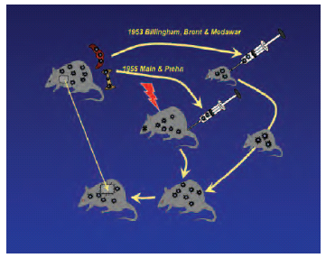 Inspired by the freemartin findings, Medawar and his colleagues demonstrated in 1953 that similar chimerism-associated tolerance could be deliberately made. In their experimental model, splenic or bone marrow leukocytes were infused from adult mouse donors to newborn mouse recipients, whose immune system was not developed enough to reject the cells. With leukocyte engraftment, neonatal recipients had a lifetime tolerance to skin (or other tissues) from the original leukocyte donor, but not to tissues from any other donor. These chimeric mice were analogues of future patients with immune deficiency diseases who could be treated with bone marrow transplant (Figure 9).