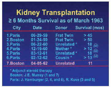 In contrast, kidney transplant with survival of at least 1 year was precociously accomplished in 7 humans between 1959 and 1962 without a preceding animal model. The first 6 patients were irradiated before transplant, but had limited therapy afterward because drug immunosuppression was not yet available. The exceptional seventh patient (bolded here) was not irradiated, but was treated daily with azathioprine throughout the 17 months of graft function (Figure 14).