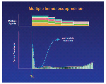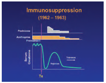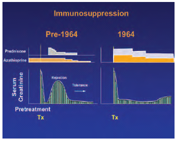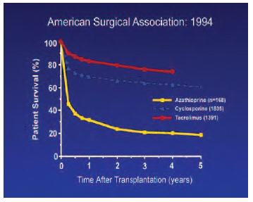The pre-emptive strategy allowed better mid-range patient and graft survival with all organs, epitomized here by the liver. With development of increasingly potent baseline drugs, the history of clinical organ transplant came to be written in terms of 3 eras defined by azathioprine-, cyclosporine-, and tacrolimus-based immunosuppression (Figure 25).