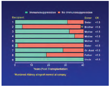 Since none of the patients was completely off drugs, the most-compelling argument that these patients were tolerant required the passage of time. Nine of the 46 renal allografts (19%) transplanted from genetically related donors functioned continuously for the next 4 decades, each depicted here as a horizontal bar. In 7 of these patients, immunosuppression eventually was stopped with subsequent drug-free intervals of 12 to 46 years (the red portion of the bars). Now, after 46 to 48 posttransplant years, these patients currently bear the longest functioning organ allografts in the world. However, no comparable cohort of drug-free kidney recipients has ever been produced again anywhere in the world in the following 40 years (Figure 20).