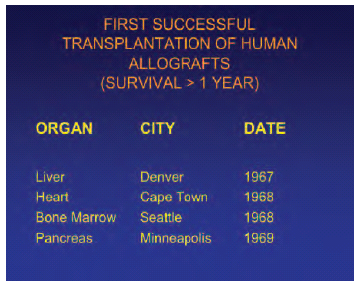 Using the triple-drug immunosuppression, my original objective of human liver transplant was finally accomplished in 1967, ten years after the first steps were taken in dogs. This was followed by the first successful heart transplants in 1968, and in 1969 by the first 1-year survival after pancreas transplant—all with the 3-drug strategy (Figure 23).
