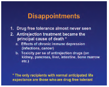 Although the golden age of transplant had arrived, there was a dark side. Chronic rejection and the devastating morbidity and mortality of long-term immunosuppression had now become nonresolvable problems. Moreover, the anticipated increase in drug-free kidney recipients that had not been rare in the pioneer experience was almost never seen again (Figure 26).