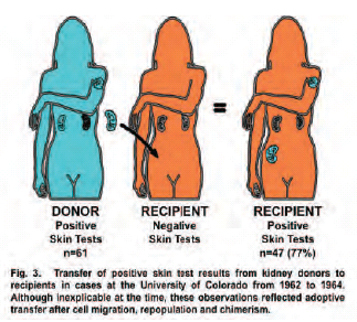 One clue was in the results of studies that had been done in our 1963 kidney transplant cases and had been reported in the Journal of Experimental Medicine. It was found that tuberculin, histoplasmin, and other positive skin tests in the donors were systematically transferred after transplant to their previously skin-test–negative kidney recipients. This evidence of chimerism-dependent adoptive transfer was not correctly interpreted until 30 years later (Figure 28).