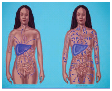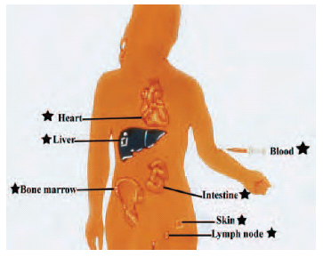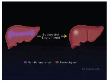 A pivotal clarifying step finally was taken in 1992 with the study of 30 liver or kidney recipients whose allografts had been functioning for up to 3 decades. Biopsies were obtained from the depicted sites and studied with sensitive immunocytochemical and molecular methods. In all 30 patients, small numbers of multilineage donor cells were detected in 1 or more of the sampled sites (Figure 39).