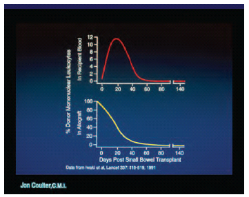 The obvious question was whether the missing donor cells had migrated into the recipient and survived. Studies of serial blood samples in rat and human recipients showed that donor cells in the early days after organ transplanting accounted for between 1% and 20% of the recipients’ circulating mononuclear leukocytes. The upper panel shows that in this human intestine recipient, the circulating donor cells quickly rose to a peak, and then diminished steadily until they were undetectable with flow cytometry after 30 to 60 days. The blood findings coincided with the disappearance of the passenger leukocytes from the graft (lower panel) (Figure 38).