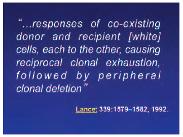 The surviving cells of the minority populations in both kinds of recipients obviously were the progeny of lymphopoietic stem cells, which had survived a violent double immune reaction the first few days or weeks after transplant. Alloengraftment was explained in our report by “. . . responses of co-existing donor and recipient cells, each to the other, resulting in reciprocal clonal exhaustion, followed by peripheral clonal deletion.” These mechanisms coincided with the reversal of rejection, and the development of variable tolerance first observed in kidney and liver recipients 30 years earlier (Figure 42).