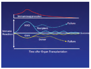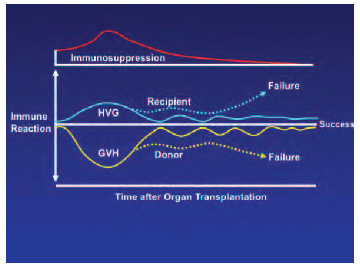 The host response (the upright blue curve) was the dominant one in most cases of organ transplant. But there also was a graft-versus-host reaction (the yellow-inverted curve) that in exceptional cases was expressed as clinical GVHD. The GVHD complication usually was in recipients of a leukocyte-rich organ (a liver or intestine), but it also has been seen, albeit rarely, in kidney recipients (Figure 43).