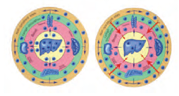 Colonialization of the donor leukocytes is graphically summarized in the circle on your left: from the organ via blood to the lymphoid compartment (the green halo). However, some of the donor cells can escape to nonlymphoid areas (the light-brown outer rim). We postulated that donor leukocytes percolated back from these protected sites to host lymphoid organs (the inward pointing red arrows in the right circle) and maintained the clonal exhaustion-deletion achieved at the outset. Despite much supporting evidence, our tolerance paradigm was viewed skeptically or repudiated outright by many critics (Figure 48).