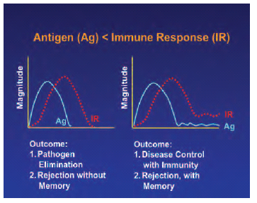 All infection and transplant outcomes—no matter what the pathogen or what kind of allograft—can be reduced to simple diagrams. The diagrams display the balance reached between antigen with access to host lymphoid organs (solid line) and the number of cytolytic T cells induced by the antigen at these lymphoid sites (dotted line). In the left panel, the antigen-specific clonal response catches up with the replicating antigen and gains ascendance. With complete elimination of a virus, or of the analogous donor leukocytes, the antigen-specific immune response is terminated without memory. Neither the infected patient nor the recipient of the failed allograft have been immunized. However, with the usual outcome shown in the right panel, viruses, or the analogous donor leukocytes that have survived in protected sites, can leak back into the host lymphoid organs and perpetuate cellular plus antibody memory (Figure 53).