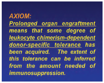 It is axiomatic that long-term organ engraftment means that the recipient has developed some degree of chimerism-dependent donor-specific tolerance—without or with the aid of immunosuppression. The completeness of the tolerance can be inferred from the amount of immunosuppression required to maintain stable function and structure of the graft (Figure 55).