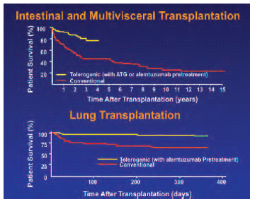 Both components of the strategy were implemented on the Pittsburgh organ transplant service in July 2001. The results and quality of life of all kinds of organ recipients were improved. The greatest effect was on the procedures with the most-troubled histories. Intestinal and lung transplant had been targets of criticism for years because of their high mortality. With a 25% gain in survival and greatly improved quality of life with tolerogenic immunosuppression (the yellow survival curves), both of these operations became reliable clinical services (Figure 60).