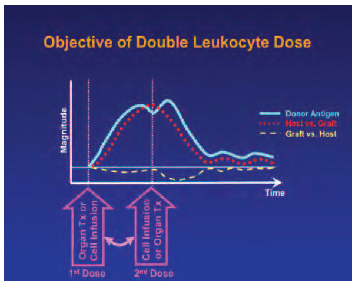 This could be readily done in organ recipients with a properly timed adjunct infusion of donor leukocytes. The objective was to begin the donor-specific tolerization well before arrival of the transplanted organ. The second cell dose of the organ passenger leukocytes is depicted by the secondary antigen hump (Figure 63).