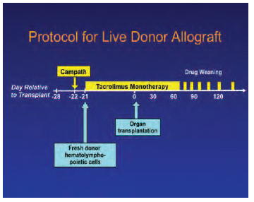 This strategy was used with encouraging results in Pittsburgh in 2006 in a small number of kidney and liver recipients whose organs were obtained from live donors. Three weeks before the organ transplant, cells were obtained from the donors by leukapheresis and infused into the recipients who had been lymphoid depleted the previous day with campath. The second bolus of leukocytes came 3 weeks later with the surge of passenger leukocytes from the transplanted organ. Immune suppression throughout was with tacrolimus, from which weaning was considered after about 4 months (Figure 64).
