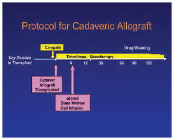 To achieve the effect of 2 leukocyte dosages in recipients of deceased-donor grafts, it would be necessary to reverse the order of events. Lymphoid depletion followed by transplant of the deceased-donor graft would have to be the first step, with the infusion 2 or 3 weeks later of stored leukocytes obtained from the deceased donor at the time of the original tissue and organ retrieval. Our original plan was to test this protocol in organ recipients, and then apply it for hand and face transplant. This eventually was done the other way round (Figure 65).