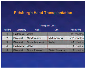 Suffice it to say the challenge was met by Dr. Lee and his associates in the 5 patients listed here in whom bilateral or unilateral hand transplants were successfully done with the immunosuppression protocol that included cell infusion. All of these patients are on low-dose single-drug immuno­suppression (Figure 68).
