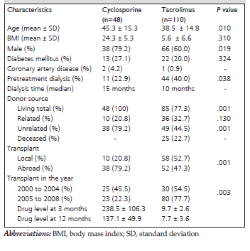 A total of 158 patients were included in this analysis (48 in the cyclosporine-treated group and 110 in the tacrolimus group). All patients were Saudis. Demographic data for the patients are shown in Table 1.