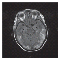 Within days of admission, her mental status declined requiring initiation of mechanical ventilation. The patient remained febrile during her hospital course (> 7 days) and eventually became hemodynamically unstable and developed a shock state requiring multiple vasopressor agents. A magnetic resonance image of the brain (Figure 1) demonstrated areas of subcortical T2 signal abnormality involving the posterior temporal, parietal, and occipital lobes. Cerebral spinal fluid analysis revealed clear, colorless fluid with 2 red blood cells/µL and no white blood cell count, with an elevated glucose of 6.27 mmol/L, and protein of 6.2 g/L. Cerebral spinal fluid cultures, blood cultures, and urine cultures were negative for bacterial, acid-fast bacteria, fungal, and viral infections. Cerebral spinal fluid was also negative for Epstein-Barr virus DNA, enterovirus RNA, JC virus DNA, varicella-zoster virus DNA, West Nile virus DNA, and herpes simplex virus DNA. Further blood work-up included Epstein-Barr virus, parvovirus B19, herpes simplex virus, human herpesvirus 6, human herpesvirus 8, and cytomegalovirus, all negative by polymerase chain reaction analysis for DNA. An electroencephalogram was performed, finding multifocal and independent epileptiform discharges independently over both hemispheres with moderate bihemispheric slow-wave activity.