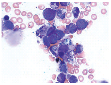 Hemophagocytic lymphohistiocytosis is characterized by the presence of prolonged fever (> 7 days), pancytopenia, and splenomegaly. Additional findings may include generalized rash, neurologic symptoms, and systemic lymphadenopathy. Diagnosis of the disease is supported by the certain laboratory abnormalities (cytopenia in at least 2 cell lines, hypertriglyceridemia, hypofibrinogenemia, low or absent natural killer cell activity, elevated ferritin level, and high soluble CD 25 level).5 Unfortunately, clinical and laboratory findings are nonspecific and may be difficult to distinguish from those of the underlying disease. The presence of hemophagocytosis (activated macrophages engulf different types of blood cells) is considered diagnostic6; nevertheless, this phenomenon may be absent early on, during the disease.7