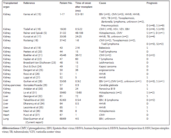 Table 3. Reported cases of hemophagocytic lymphohistiocytosis in solid organ transplant recipients.