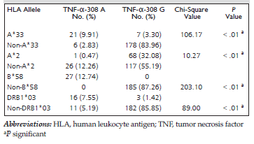 Table 1. Association Between HLA-A*2, -A*33, -B*58, and -DRB1*03 Alleles and TNF-α-308 A/G (n=212)