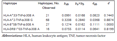a positive LD between HLA-A*33 and TNF-α-308 A (d’=0.7443; Table 2).