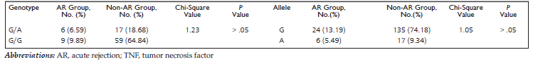 Table 4. Distribution of TNF-α-308 Genotype and Allele in Lung Transplant Recipients, According to Group (n=91)