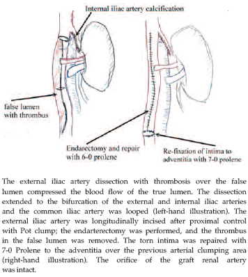 The operation was performed again with intimal repair immediately, thereby restoring blood flow to the allograft and the right lower limb. Percutaneous transluminal angioplasty with stent was successful in 3 cases and 1 case was given bypass surgery. Though open-end arterectomy was unsuccessful in the fifth case, implantation of an endovascular metallic stent avoided occlusion of the ostium of the renal graft artery and preserved blood flow. Our case is the only one in which endarterectomy with thrombus removal in the false lumen and intimal repair were performed.