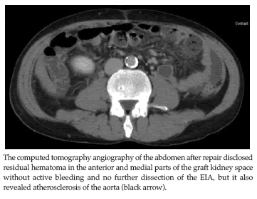 The following Doppler sonography of the graft kidney disclosed adequate perfusion without focal defect, and the serum creatinine concentration was 91.5 µmol/L 1 week after RTx. The pathology of the torn intima of the EIA showed only a mild intimal tear with mild atherosclerosis (Figure 2). The following computed tomography angiography of the abdomen after repair disclosed residual hematoma in anterior and medial parts of the graft kidney space without active bleeding, and no further dissection of the EIA (Figure 3), but it also revealed atherosclerosis of the aorta. For anticoagulation, heparinization with low molecular weight heparin was given for 3 days. Lifelong clopidogrel also was prescribed.The patient was discharged with a serum creatinine concentration level of 99.1 µmol/L without claudication 14 days postoperatively.