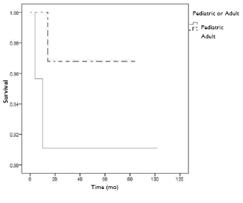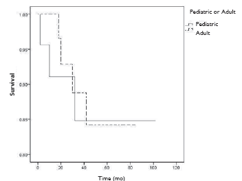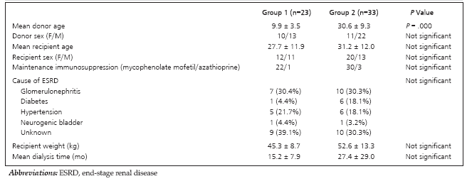 Materials and Methods: This historical cohort study involved 2 groups. Group 1 included 23 first kidney adult recipients who received their first renal transplant from pediatric deceased-donor donors. Group 2 consisted of 33 first renal transplant adult recipients with kidneys coming from adult deceased donors. The Kaplan-Meier method was used to generate graft survival and patient survival curves. The log-rank test was done to compare differences between survival outcomes.
