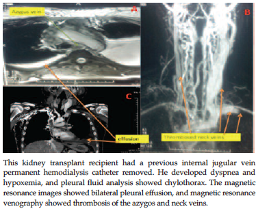 Chylothorax is the accumulation of chyle in the pleural cavity as a result of damage to the lymphatic ducts. We treated a young man who was a kidney transplant recipient who had a prior internal jugular vein permanent catheter for hemodialysis, who developed dyspnea and hypoxemia. Chest radiography showed bilateral pleural effusion. Analysis of the white, milky, cloudy, odorless effusion fluid showed cell count > 500/μL; lymphocytes, 60%; total protein, 3.6 mg/dL; urea nitrogen, 45 mg/dL; creatinine, 90 μmol/L; triglycerides, above 2.2 mmol/L (repeatedly high); lactate dehydrogenase, 450 U/L (normal); and cultures, no growth. Magnetic resonance imaging showed thrombosis of the major neck veins, superior vena cava, and azygos vein. Treatment included pleural drains, gut rest, and dietary modification, octreotide, and warfarin. The chylothorax resolved with no relapse. In summary, chylothorax may occur in patients associated with thrombosis of major veins associated with a permanent dialysis catheter.