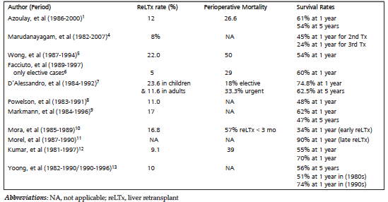 The mechanism underlying the lower survival rate associated with reLTx remains to be defined, although multiorgan dysfunction associated with failing grafts appears to contribute to the high perioperative mortality.