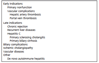 Late indications for reLTx are generally seen at least 30 days after primary liver transplant, and these include chronic rejection, biliary complications, or recurrence of the primary disease such as hepatitis C, autoimmune hepatitis, or primary sclerosing cholangitis. Hepatic artery thrombosis and subsequent ischemic cholangiopathy most often start in the early posttransplant period, but can be seen later (Table 2).19,22