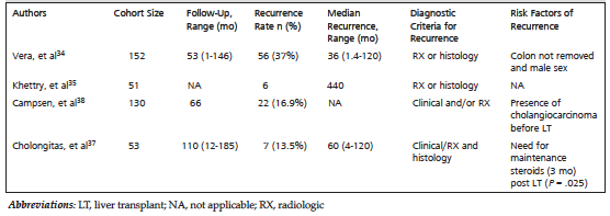 37. Cholongitas E, Shusang V, Papatheodoridis GV, et al. Risk factors for recurrence of primary sclerosing cholangitis after liver transplantation. Liver Transpl. 2008;14(2):138-143.