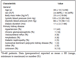 There were 40 patients included in the study (Table 1). Most patients had dialysis before transplant (hemodialysis, 19 patients [48%]; peritoneal dialysis, 7 patients [18%]), and 14 patients (35%) had preemptive renal transplant. Baseline drugs included calcium channel blockers in 11 patients (28%), angiotensin-converting enzyme inhibitors in 3 patients (8%), acetylsalicylic acid in 3 patients (8%), β-blockers in 3 patients (8%), statins in 3 (8%) patients, and diuretics in 2 patients (5%). Nutritional supplements included vitamin D in 6 patients (15%), vitamin B12 in 4 patients (10%), and folate in 2 patients (5%).