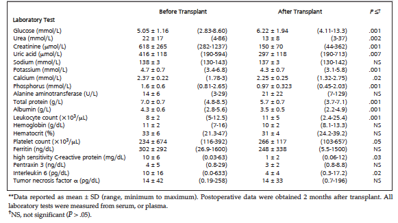 The laboratory studies showed a significant increase from before to after transplant in mean serum glucose, leukocyte count and platelet count and significant decrease in mean urea, creatinine, uric acid, potassium, calcium, phosphorus, total protein, albumin, high-sensitivity c-reactive protein (hsCRP), and IL-6 levels (Table 2 and Figure 1).