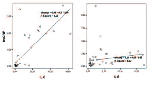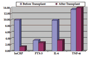 Results: After transplant, mean levels of high sensitivity C-reactive protein and interleukin 6 decreased but levels of pentraxin 3 and tumor necrosis factor α did not change. There were significant correlations between interleukin 6 and high sensitivity C-reactive protein before transplant (r = 0.71; P ≤ .0001) and after transplant (r = 0.45; P ≤ .003). There was no correlation between tumor necrosis factor α and high sensitivity C-reactive protein before transplant, but there was a significant correlation between tumor necrosis factor α and high sensitivity C-reactive protein after transplant (r = 0.36; P ≤ .03). There was no correlation between interleukin 6 and pentraxin 3, tumor necrosis factor α and pentraxin 3, or high sensitivity C-reactive protein and pentraxin 3 before or after transplant.