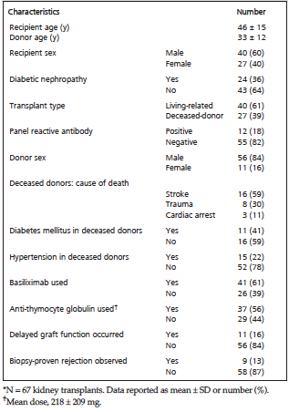 In this prospective cohort study, all 67 consecutive patients who received a living-related or deceased-donor kidney transplant at King Abdulaziz Medical City, Riyadh, between July 2011 and September 2012 were evaluated. Written informed consent was obtained from all participants. The study was approved by the local institutional review board.