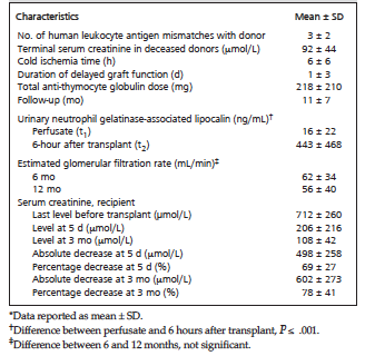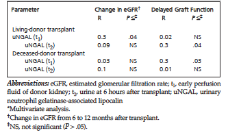 Conclusions: Urinary neutrophil gelatinase-associated lipocalin levels in the donor kidney perfusate and 6 hours after transplant may be a useful predictor of delayed graft function and decreased graft function from 6 to 12 months after transplant.