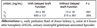 In summary, we confirmed that uNGAL concentrations measured during the first day after kidney transplant may be useful in predicting the development of delayed graft function. In addition, uNGAL measured in the donor kidney perfusate also may help predict the development of delayed graft function and decreased short-term graft function.
