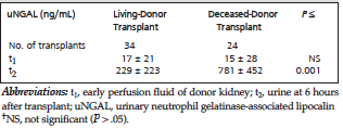 Materials and Methods: In this prospective cohort study of 67 consecutive patients who received a living-related (40 patients [61%]) or deceased-donor kidney transplant (27 patients [39%]), urinary neutrophil gelatinase-associated lipocalin was determined in the first 100 mL perfusate of the donor kidney and in urine at 6 hours after transplant. Patients were followed (11 ± 7 mo) for changes in estimated glomerular filtration rate and delayed graft function.