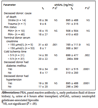 Results: The mean urinary neutrophil gelatinase-associated lipocalin level at 6 hours after transplant was significantly higher after deceased-donor (781 ± 452 ng/mL) than living-donor transplant (229 ± 223 ng/mL; P ≤ 0.001). The decrease in estimated glomerular filtration rate from 6 to 12 months after transplant was positively correlated with the urinary neutrophil gelatinase-associated lipocalin levels in the perfusate in living-donor transplant. A significant correlation was noted between the occurrence of delayed graft function and the urinary neutrophil gelatinase-associated lipocalin level at 6 hours after living-donor transplant. In the deceased-donor group, the occurrence of delayed graft function was correlated with urinary neutrophil gelatinase-associated lipocalin levels in the perfusate. In deceased-donor kidney transplant, the mean urinary neutrophil gelatinase-associated lipocalin level in the perfusion fluid was significantly greater from donors who had terminal serum creatinine > 150 μmol/L, and urinary neutrophil gelatinase-associated lipocalin level at 6 hours after transplant was significantly greater in transplants with longer cold ischemia time and donors who had hypertension.