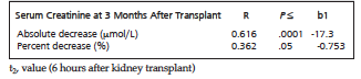 There was no correlation observed between the uNGAL levels in the perfusion fluid and the absolute or percent decrease in serum creatinine from baseline (before transplant) to 5 days or 3 months after transplant. However there was significant negative correlation between the absolute and percent decrease in serum creatinine at 3 months after transplant and the uNGAL levels at 6 hours after transplant (t2 sample) (Table 7).