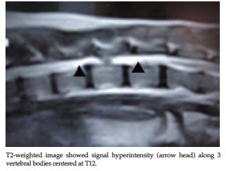 A computed tomography scan before surgery showed calcified herniated disk tissue in the vertebral canal centered at the T11-T12 intervertebral space; postoperative computed tomography scan confirmed that the herniated disk tissue had been removed (Figure 2). The T2-weighted magnetic resonance imaging scan after surgery showed signal hyperintensity along 3 vertebral bodies centered at T12 (Figure 3). No adverse events were observed in follow-up examinations at 180, 365, 545, 730, and 1245 days after transplant.