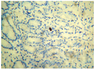 In June 2012, a gastrointestinal endoscopy was repeated, which showed linear erosions in the distal body and the antrum of the stomach, associated with ulcerations. A biopsy specimen showed mildly edematous lamina propria with lymphocytic infiltrates. Multiple CMV inclusions, both cytoplasmic and intranuclear, were seen in the gastric glands. Immunohistochemical staining with CMV specific-labeled antibody was positive (Figures 1 and 2). A diagnosis of CMV gastritis was made. The patient’s CMV viral load in the blood by polymerase chain reaction (PCR) was below the detectable limit. The patient’s MMF was stopped, and she was treated with intravenous ganciclovir 2.5 mg/kg/day (according to the estimated glomerular filtration rate) for 21 days, followed by oral valganciclovir for 3 months. After beginning this therapy, her symptoms began to improve in 10 to 15 days. She did not tolerate the ganciclovir well, and this therapy had to be stopped twice because of leucopoenia that required administration of granulocyte colony-stimulating factor. The results of a repeat gastric biopsy showed healing of the lesions with an absence of inclusions on histopathology.