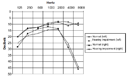 Characteristics and course of hearing impairment were assessed by the questionnaire. The following problems were asked (1) general hearing problems, (2) sudden hearing loss, (3) chronic hearing loss, (4) speech understanding, (5) tinnitus, (6) middle ear infection, and (7) vertigo. Otoscopy revealed for all patients. All patients underwent audiologic assessment by means of pure-tone audiometry. Patients were examined inside an acoustic cabin using an AC-40 Interacoustics audiometer (Interacoustics AS, Assens, Denmark) to perform pure-tone audiometry. The 125, 250, 500, 1000, 2000, 4000, and 8000 Hz frequencies were tested by air conduction.