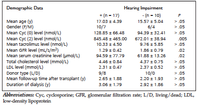 In the hearing impairment group 9 patients received living related donor allograft and the remaining 8 were from deceased donors, but all patients without hearing impairment received living-related donor allograft. Estimated glomerular filtration rate was low in hearing impairment group (mean, 77.23 ± 25.34 mL/min/1.73m2) when compared without hearing impairment group (mean, 111.40 ± 47.10 mL/min/1.73m2) (P = .02). Blood pressure was not associated with hearing impairment and speech understanding (P > .05). Groups of patients with and without hearing impairment were similar for renal failure cause, duration of dialysis, other immunosuppressive treatments, and lipid values.