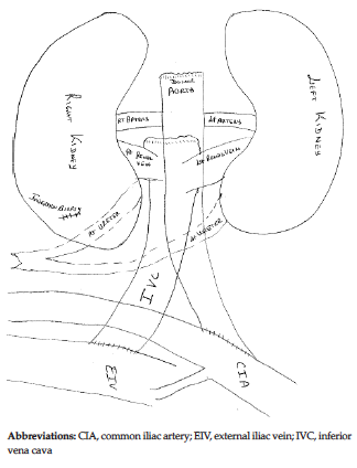 Materials and Methods: The kidneys were recovered en bloc with the aorta and inferior vena cava. Meticulous back table work was required in ligating all the nonrenal tributaries of the donor aorta and inferior vena cava. We anastomosed the aorta to the common iliac artery in an oblique end-to-side fashion. The donor inferior vena cava was anastomosed to the external iliac vein in an end-to-side fashion. The distal ends of ureters were made into a common lumen with a side-to-side anastomosis, and this common ureter was implanted into the bladder.