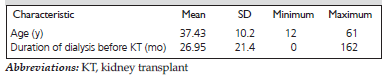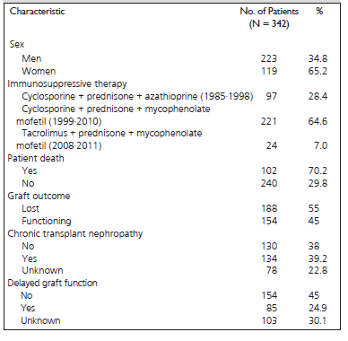 A total of 342 patients were reviewed. Some demographic and clinical characteristics of recipients and donors are presented in Tables 1 to 4. Patient observation times ranged from 1 day to 25 years. The maximum term of dialysis before KT was 162 months.