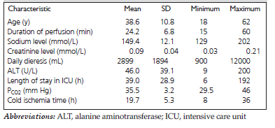 Correlation analysis showed a statistically significant negative correlation between donor age and life expectancy of patients (Kendall coefficient k = −0.85; P = .046), ie, the younger the donor, the longer the survival of the recipient. There was no significant correlation between donor age and duration of graft functioning. Patients who received kidneys from older donors also had longer time to creatinine nor-malization (Pearson coefficient k = 0.142; P = .047).